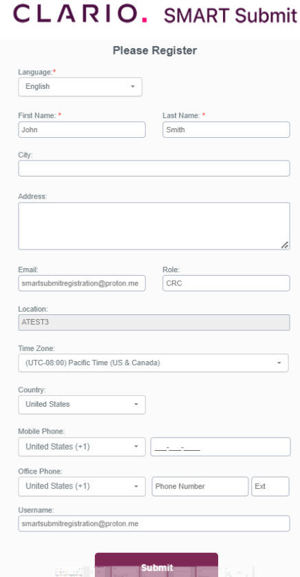 When you arrive at the registration webpage, you’ll see some of the information is already filled in. This information cannot be changed. If any of this information is inaccurate, please send an email to smart.submit@clario.com to request corrections. They will send you a new email to restart the registration process with the corrected information.
