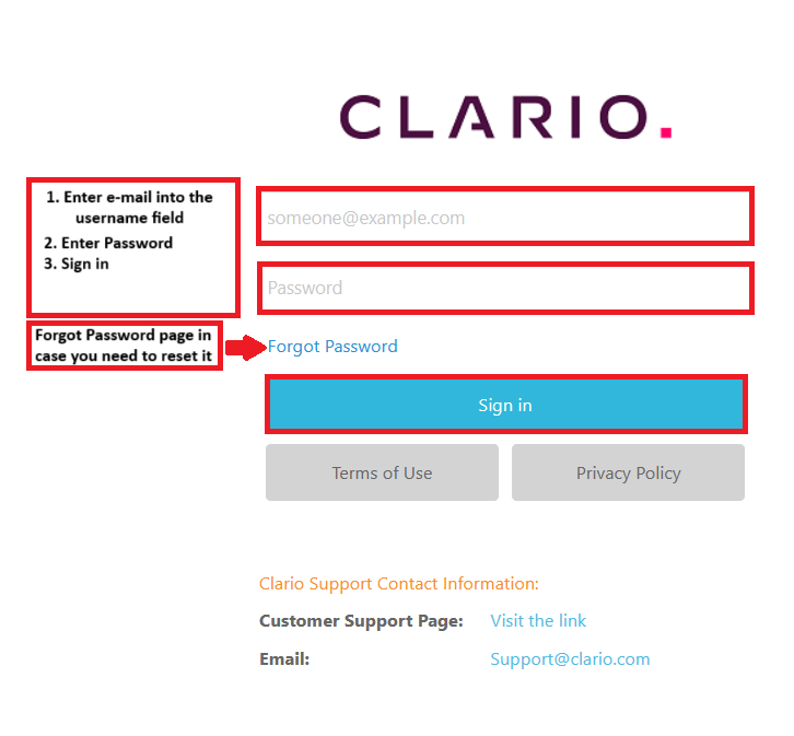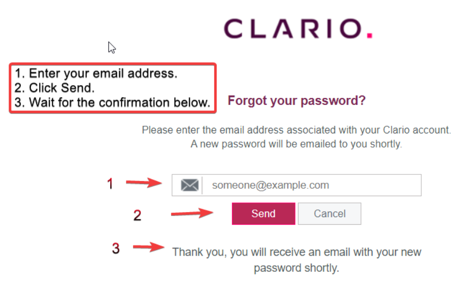 If you do not remember your Clario password or if the temporary password provided is rejected, one can use the forgot password function on the login page. Simply enter your email into the box, click send then wait for the on page confirmation, which can take a few minutes to show up. Once it does check your email for the new temporary password.